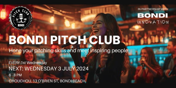 Our next monthly Social Networking Drinks is on this Wednesday after our very fun relaunch! Our second monthly Coastal Walk & Talk is on 28 June. The inaugural Bondi Pitch Club was amazing, see the story and register to pitch at the next one on 3 July below, or register to attend !